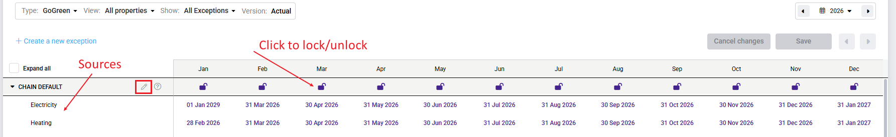 - GoGreen sources with lock dates per source and month are clearly displayed.