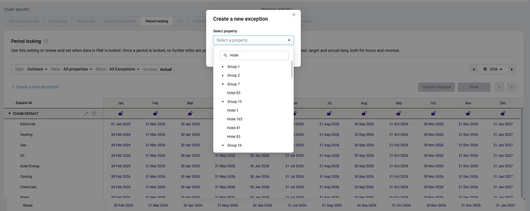 Use a property exception when one hotel needs different lock timing than the chain default. Exceptions help you avoid opening a period for the whole chain when only one property needs access.