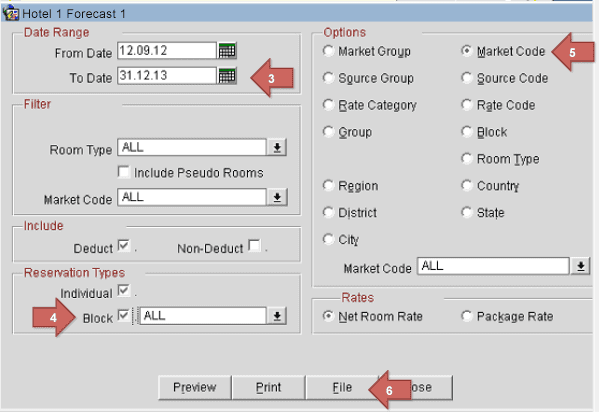 Since there is a need for a 12-month worth of historic reservation data, this report is also often used for this purpose. An example: if PMI is to go live (i.e. be ready for business use) on Jun. 1st 2012, the historical revenue data load needs to consist of values pertaining to Jun. 1st 2011 (“From” – ref. step 7 above) up until and including May 31st 2012 (“To” – ref. step 7 above).