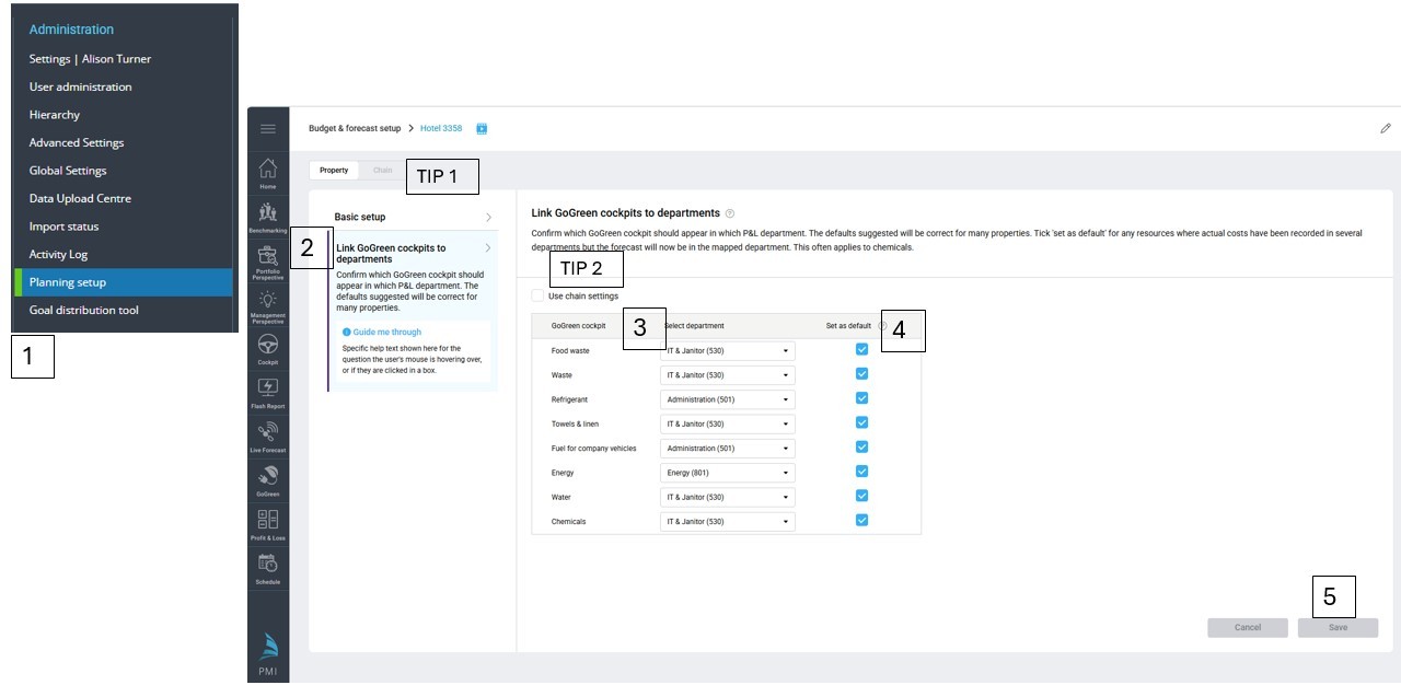 Image description: Planning setup module open at the setting ‘Link GoGreen cockpits to departments’ on the property page