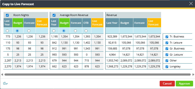 You can copy values for rooms and all non-room departments, depending on the available metrics (room nights, revenue, covers, or average revenues).