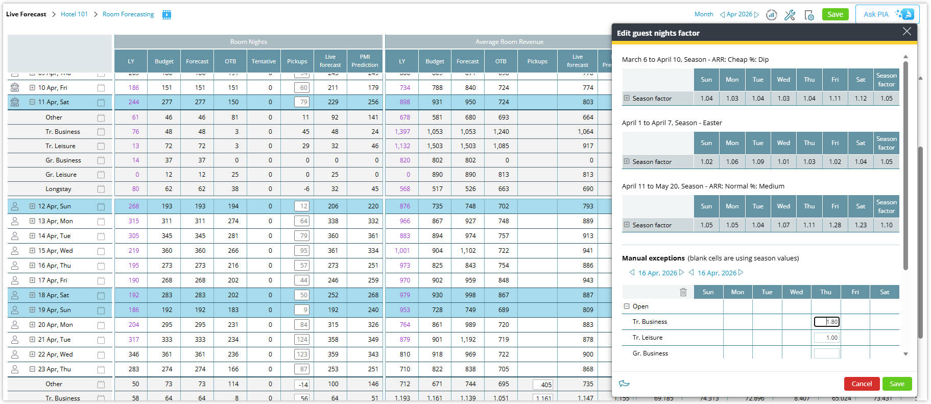 In PMI, the Guest nights factor is automatically generated based on the PMI seasons used in the Live forecast and the day of the week.