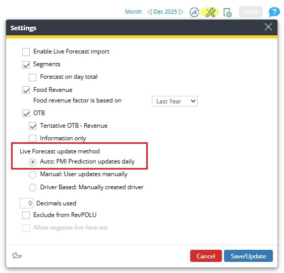 Non-Rooms PMI Prediction provides an automated daily forecast for non-room revenue and activity drivers. It helps you build a more accurate Live Forecast by identifying patterns, seasonality, and trends unique to your property. The system updates daily as new data is received.