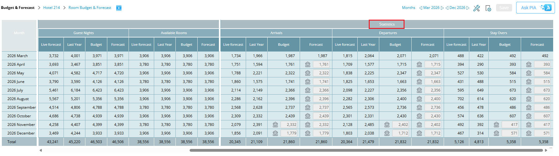 Arrivals, departures, and stay-over forecasts and budgets can be viewed and adjusted in the Budget and forecast module. Users can review the monthly totals and manually adjust them when needed.