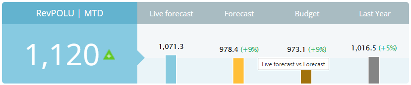 The RevPOLU overview column chart now displays variance percentages showing how Actual/Live forecast month-end (current month actual MTD + live forecast) compares to Forecast, Budget/Target, and Last year.